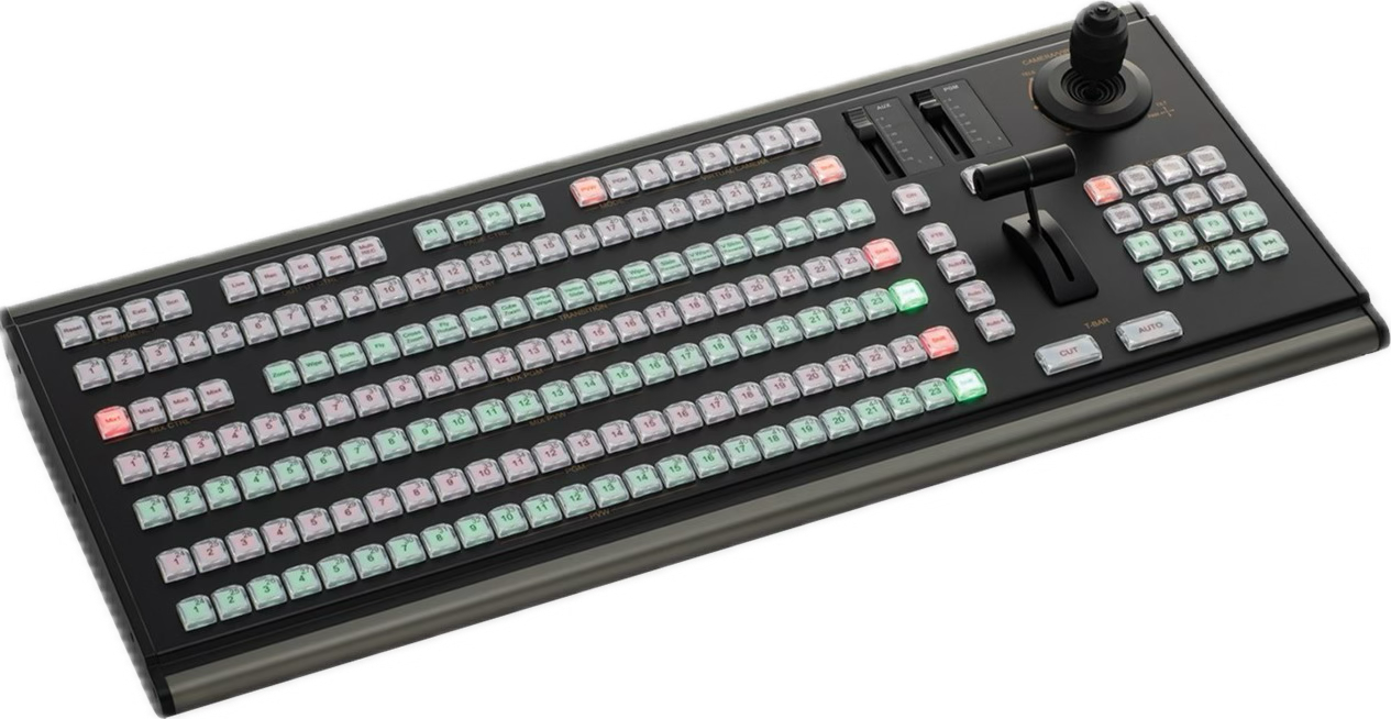 Featuring 188 high-quality curved buttons, all designed with backlighting, control every aspect of your production with ease. Enjoy M/E Mix Control, overlays, custom triggers, PTZ camera control via joystick, macro control buttons, and media & GT designer ticker transport controls.